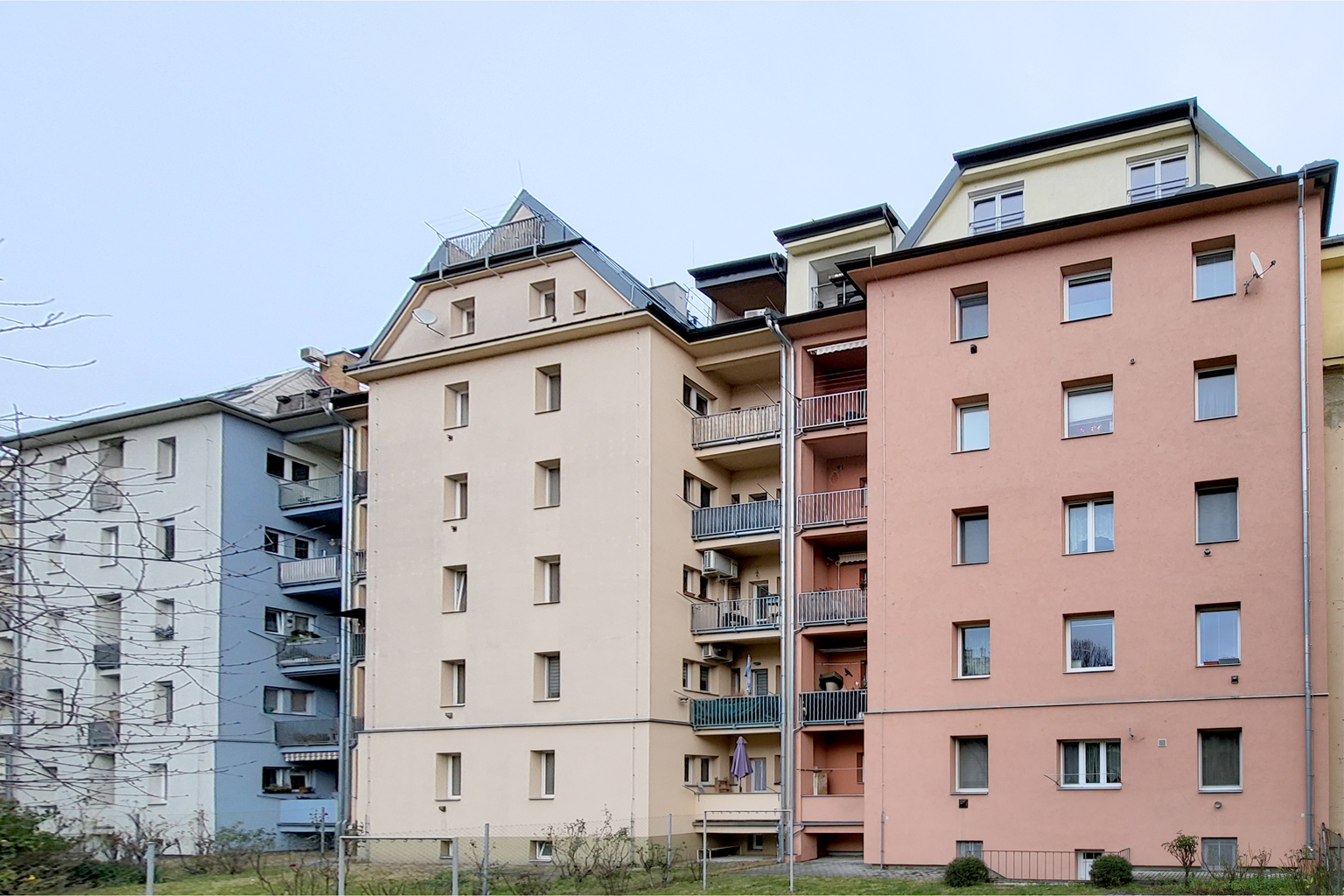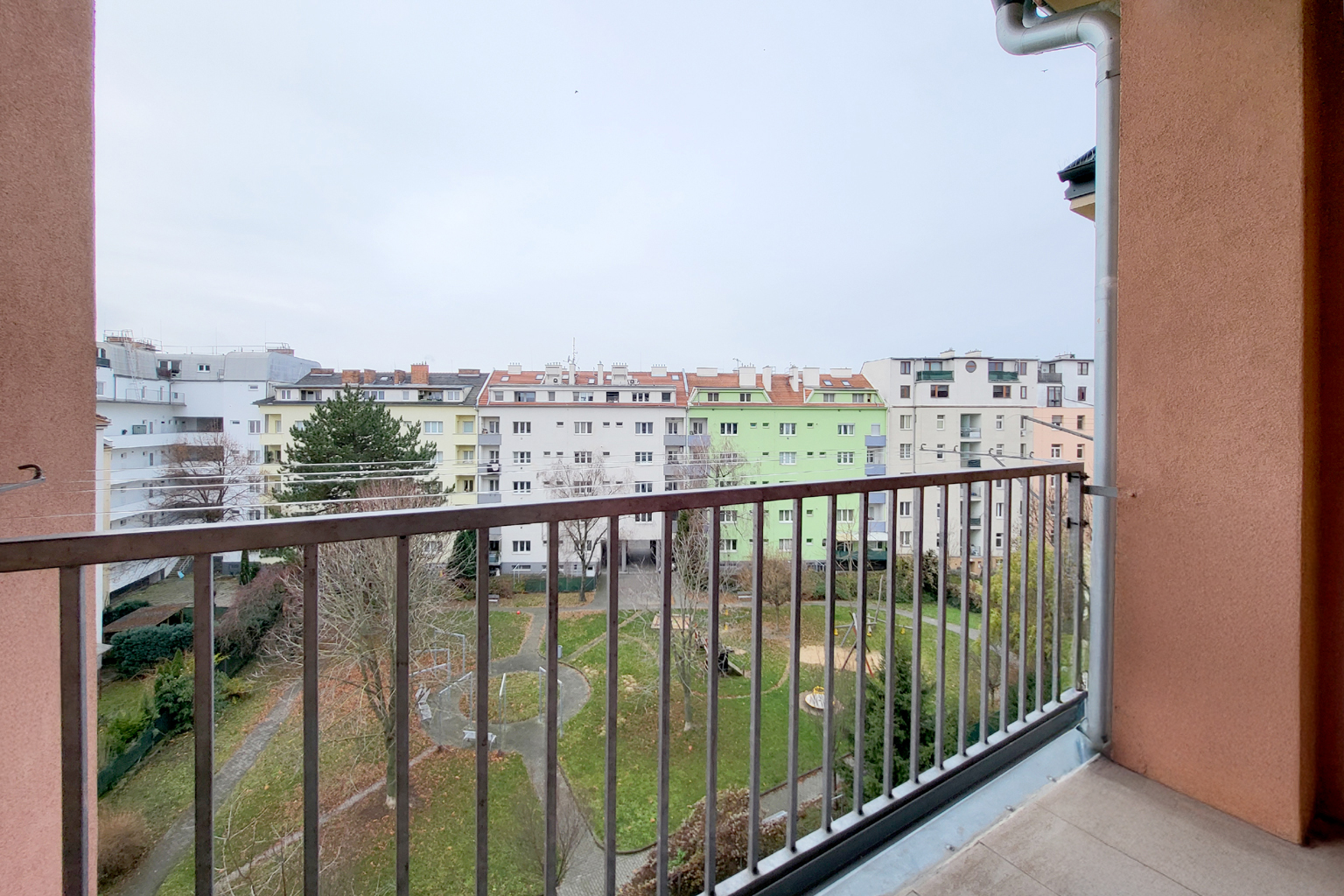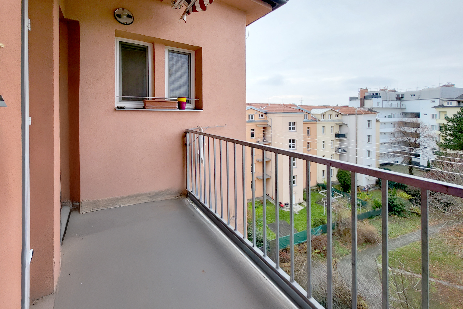 Lodžie orientovaná do klidného vnitrobloku je pak ideálním místem pro kávu, snídani nebo večerní posezení. Vnitroblok samotný vás možná překvapí – je tu dětské hřiště, zeleň, lavičky… a celkově atmosféra malého komunitního světa schovaného mezi domy.